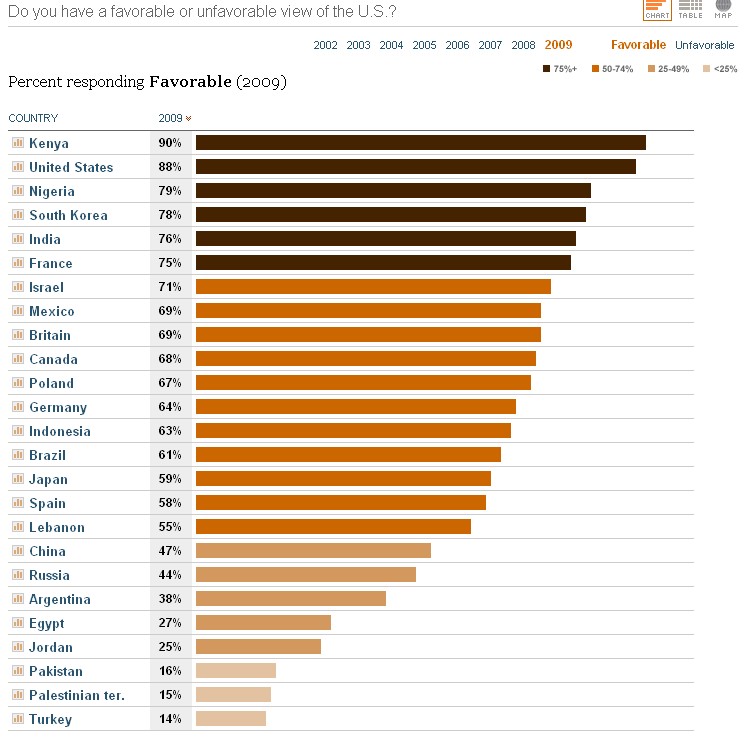 Check out the responses to the question “Do you have a favorable or unfavorable view of the U.S.?” from various countries. Isn’t it surprising that Indians view the US favorably (76% positive) — even though the US government is at least mildly antagonistic towards India — and that the US government pours in billions of dollars worth of aid to Pakistan and yet only 16% of Pakistanis hold a favorable view of the US — and perhaps a majority hold it in deep contempt?