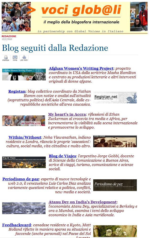 We are thrilled to inform you that your blog has been included in a new journalism project called “Voci Globali: il meglio della blogosfera internazionale“, a partnership between Global Voices Online in Italian and La Stampa, a major Italian newspaper.