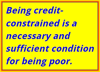 But that definition is not comprehensive. What if a person could borrow the money needed for an investment with a sufficiently high return such that it would be possible to return the money with interest, and still have some left over? Then the person is not poor. Meaning, anyone able to borrow is not poor. Conversely, anyone who is unable to borrow is “credit-constrained” and is comprehensively poor.