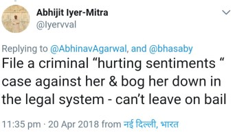 Curiously, Mr Iyer-Mitra is not all that exercised about free speech. Here’s what he wrote in a tweet some time ago. Throw someone in jail for “hurting sentiments.”