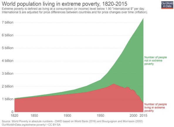 “In 1820, the vast majority of people lived in extreme poverty and only a tiny elite enjoyed higher standards of living. Economic growth over the last 200 years completely transformed our world, with the share of the world population living in extreme poverty falling continuously over the last two centuries. This is even more remarkable when we consider that the population increased 7-fold over the same time. In a world without economic growth, an increase in the population would result in less and less income for everyone. A 7-fold increase in the world population would be potentially enough to drive everyone into extreme poverty. Yet, the exact opposite happened. In a time of unprecedented population growth, we managed to lift more and more people out of the extreme poverty of the past.” [Source: Click on the image above.]