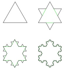 “The Koch snowflake can be built up iteratively, in a sequence of stages. The first stage is an equilateral triangle, and each successive stage is formed from adding outward bends to each side of the previous stage, making smaller equilateral triangles. The areas enclosed by the successive stages in the construction of the snowflake converge to 8/5 times the area of the original triangle, while the perimeters of the successive stages increase without bound. Consequently, the snowflake encloses a finite area, but has an infinite perimeter.”