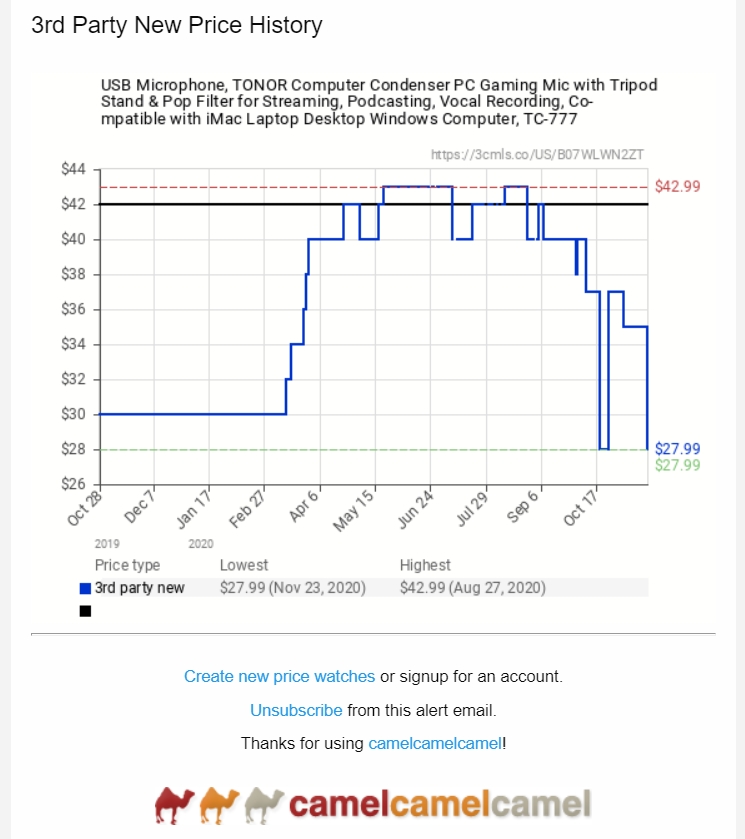 When I am in no hurry to buy something I am interested in, I tag it on camelcamelcamel.com, the Amazon price-tracking site. Recently I was interested in a microphone. The image on the left (click to embiggen) shows how the price moved. I ordered it and as it happened, it did not suit my needs. I returned it. It was as easy as going to a Kohl’s store and dropping it off at a counter that handles Amazon return.