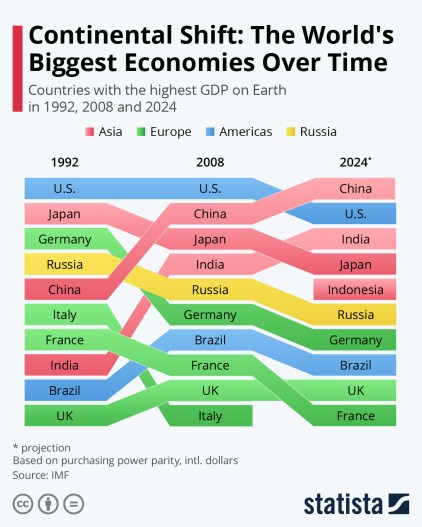Well, the one constant in this world is change. The world’s biggest economies move in their rankings over time. According to satista.com, this is projected: