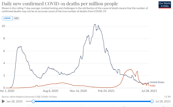 On July 27, India’s number was only 0.37 (compared to the US’s 0.90). On Jan 13th, 2021, the US number was 10.35, compared to India’s 0.14. India’s number was 2 orders of magnitude lower than the US.