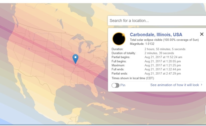 I had planned it such that I was in Chicago, IL on Aug 18. Around 4 AM on Aug 21, I drove from Chicago to Carbondale, IL, a distance of around 330 miles (550 kms). I reached around noon and was all set up to catch the totality around 1 PM.