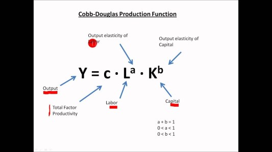 [1] Production functions are useful algebraic formulations that are used to specify the factors of production. The Cobb-Douglas production function, developed in 1927, fits production quite nicely. (Click on the image above to embiggen in a new tab.) We note that the value of the exponents a and b determine the returns to scale. If a+b is <1, then we have decreasing returns; if =1, then we have constant returns to scale; if >1, then we have increasing returns to scale.