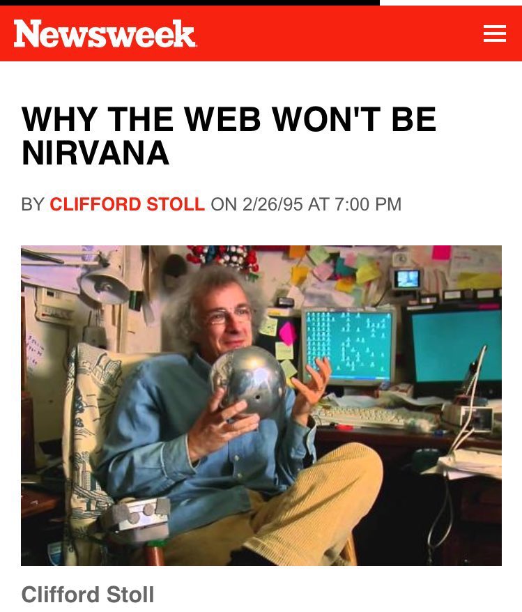 AMA – the Predictions edition “It is difficult to make predictions, especially about the future.”[1] It’s common for most predictions not to age well. Consider the one made by one Mr Clifford Stoll exactly 27 years ago in Feb 1995. He was not bullish about the web. He wrote: Continue reading “AMA – the Predictions edition” Share this: Click to share on X (Opens in new window) X Click to share on WhatsApp (Opens in new window) WhatsApp Click to share on Reddit (Opens in new window) Reddit Click to share on Tumblr (Opens in new window) Tumblr Like Loading...