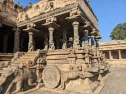 That Shiva temple was built by the Chola emperor Rajaraja II in the 12th century CE. Along with the two other temples we visited—the Brihadeeswara Temple at Thanjavur, and the Gangaikondacholisvaram Temple at Gangaikonda Cholapuram—it is a UNESCO World Heritage Site. All three are collectively known as the Great Living Chola Temples.