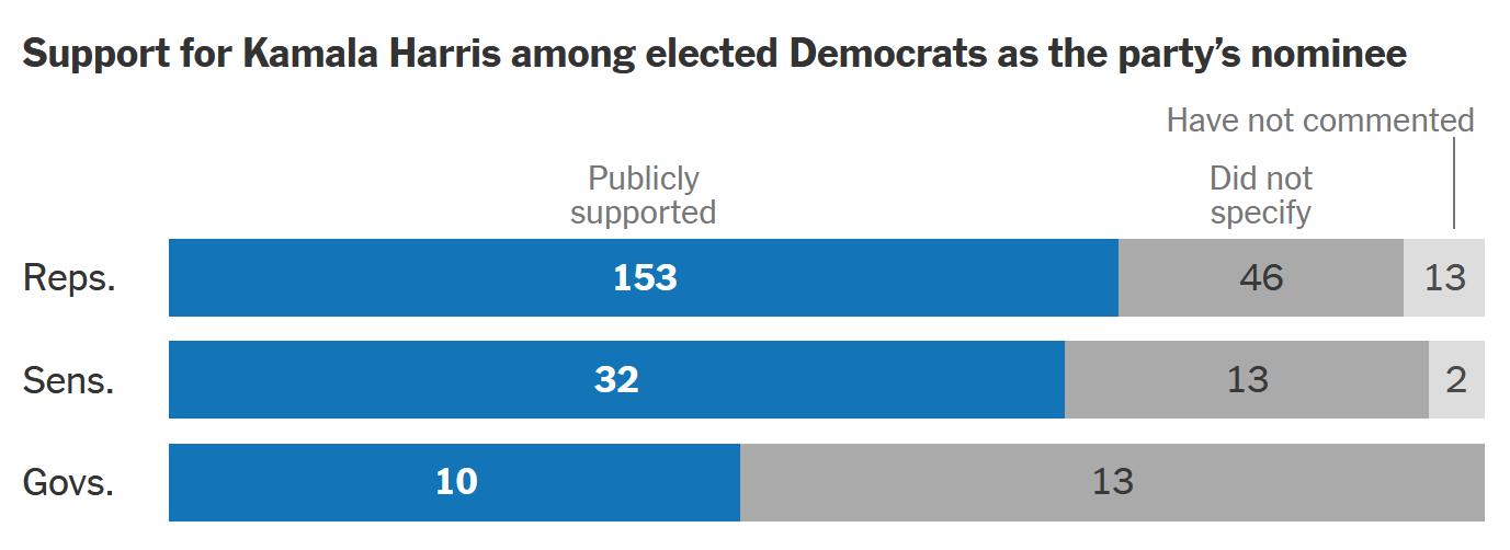 So what comes next for the Democratic party? Biden endorsed Kamala Harris. The NY Times reports, as of July 22nd, the support for Harris stands thusly: