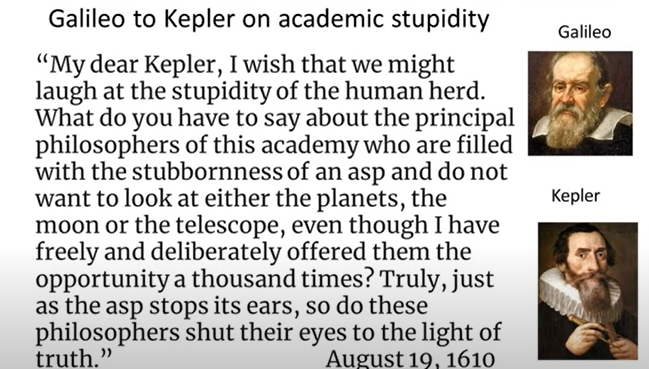 I wish we might laugh at the stupidity of the human herd. What do you have to say about the principal philosophers of this academy who are filled with stubbornness of the asp and do not want to look at either the planets, the moon or the telescope, even though I have freely and deliberately offered them the opportunity a thousand times? Truly, just as the asp stops its ears, so do these philosophers shut their eyes to the light of truth.