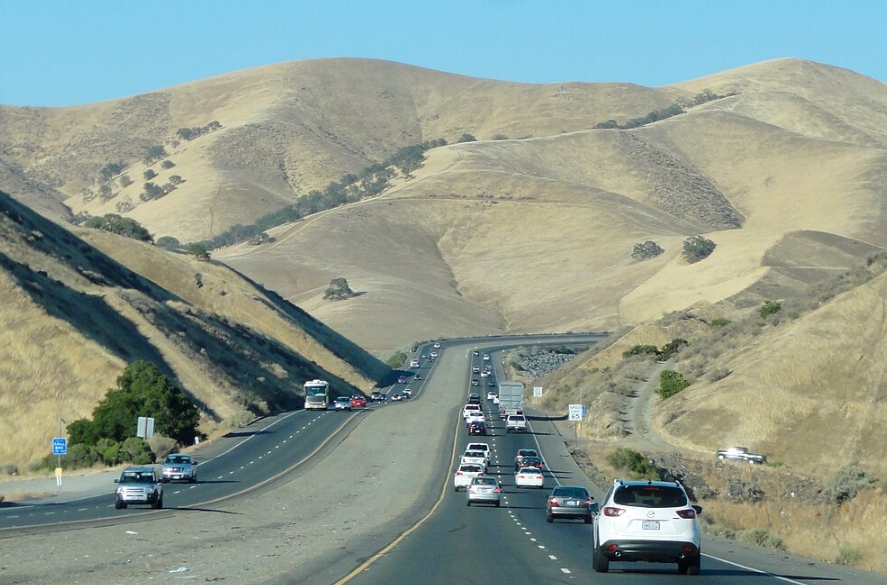 I-5 runs straight and flat through the Central Valley till you get to Bakersfield. Then I-5 climbs up the Tejon Pass (elevation 1,270 meters) over the Tehachapi mountain. That part of the roughly 600 kms trip is the most interesting. Then you come down into the San Fernando valley.