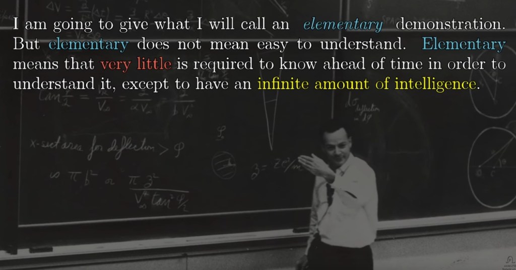 On top of being one of the greatest physicists of the 20th century CE, Feynman was a brilliant teacher. He presented complex ideas in elementary terms. Of course, one needed bring intelligence to the table. Best if one had an infinite amount of intelligence when it came to understanding the most elementary ideas.